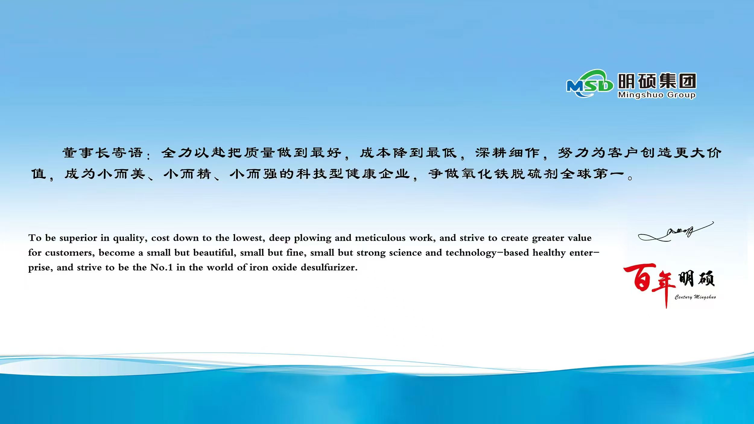 明碩產(chǎn)品分兩大系列:脫硫藥劑及脫硫裝備,其中年產(chǎn)氧化鐵系列脫硫劑20萬(wàn)噸。主要用于天然氣、石油伴生氣、煤層氣、頁(yè)巖高爐煤氣、焦?fàn)t煤氣、煤化工、沼氣、石油煉化尾氣等含硫氣體的凈化。明碩研發(fā)生產(chǎn)的羥基氧化鐵脫硫劑,擁有多項(xiàng)自主發(fā)明專(zhuān)利,該系列脫硫劑具有脫硫精度高、反應(yīng)速率快、使用周期長(zhǎng)、運(yùn)行成本低等特點(diǎn),廣泛應(yīng)用于各行業(yè)含硫化氫氣體的脫除。明碩研發(fā)的新式高效絡(luò)合鐵濕法脫硫裝備,在正常工藝條件下脫硫效率達(dá)到99.99%,達(dá)到國(guó)際先進(jìn)水平。 公司擁有自主進(jìn)出口權(quán),已為美國(guó)、加拿大、俄羅斯、德國(guó)、日本、中東及一帶一路沿線(xiàn)國(guó)家逾千家客戶(hù)提供了全套脫硫系統(tǒng)服務(wù)。